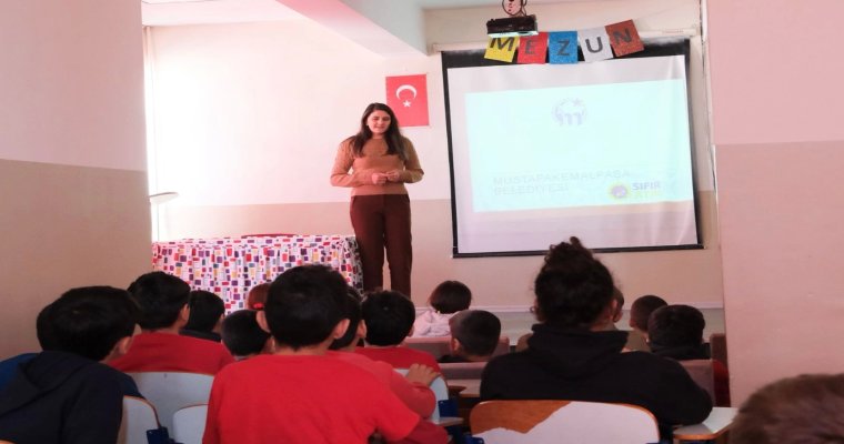 Mustafakemalpaşa Belediyesi Çevre Mühendisi verilen uygulamalı ve interaktif eğitimde öğrencilere atığın kaynağında ayrıştırılması, atık türleri, geri dönüşümün önemi, sıfır atık projesi, iklim değişikliği tanımı, iklim değişikliği ile mücadelede alınacak önlemler ve çocuklara çevre konusunda bilinçlendirme yapıldı.