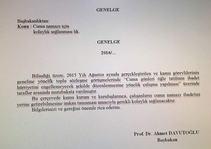 Başbakan Ahmet Davutoğlu, partisinin TBMM grup toplantısında yaptığı konuşmada, cuma günleri öğle tatilinin ibadet hürriyetini engellemeyecek şekilde kullanılabilmesi için Başbakanlık Genelgesi Taslağı hazırladıklarını ifade etmişti.