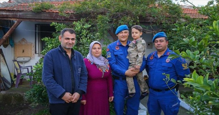 Aileye çiçek verip geçmiş olsun temennisinde bulunan jandarma ekibi, hayatını kurtardıkları çocuğa da asker kıyafeti hediye etti.