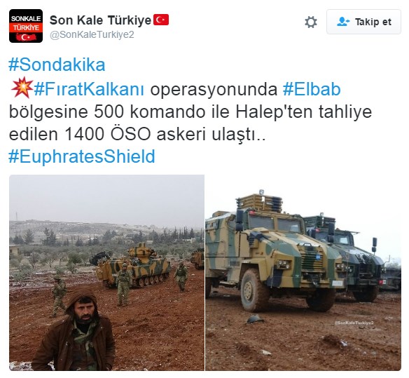 Fırat Kalkanı Harekâtı kapsamında Türk Silahlı Kuvvetleri (TSK) ve Özgür Suriye Ordusu'nca (ÖSO) Suriye'nin Bab ilçesine yönelik düzenlenen operasyon devam ediyor. İlçede en stratejik yer olan Akil Dağı'nı örgütten temizleyen Mehmetçik, Bab'ı tamamen kuşattı. Kuzey ve batı yönünde ilçeye sıfır noktaları ele geçiren ve şehrin dış mahallelerine giren birlikler, teröristlerin canlı bomba eylemlerine karşı da her an teyakkuz halinde. Bab merkezinde adım adım ilerleyen TSK ve ÖSO unsurları, teröristlerce zorla canlı kalkan yapılmış sivillere zarar vermeden hareket etmeye çalışıyor. Bab'da çok önemli görevler üstlenen Kayseri 1. Komando Tugayı'ndan en az 500 askerden oluşan bir grubun daha bölgeye gönderildiği öğrenildi. Buna ek olarak, Halep'ten tahliye edilen 1400 ÖSO askeri de Bab'a geldi.