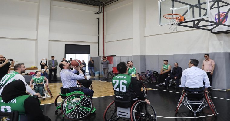 Konya Büyükşehir Belediyesi tarafından Konya Lisesi’ne kazandırılan spor salonunda gerçekleştirilen etkinlikte Konya Büyükşehir Belediye Başkanı Uğur İbrahim Altay, tekerlekli sandalyeye oturarak Konya Engelliler Spor Kulübü Tekerlekli Sandalye Basketbol Takımı sporcularıyla ile maç yaptı.