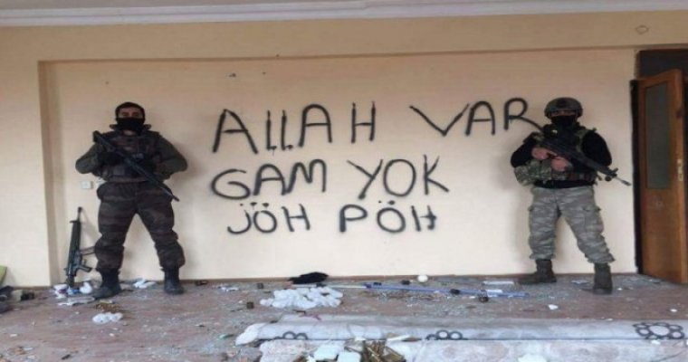 Polis asker dayanışmasının yaşandığı operasyon bölgesinden yeni bir fotoğraf geldi. Bir asker ve bir polis, duvara "Allah var gam yok" yazarak fotoğrafı paylaştı.